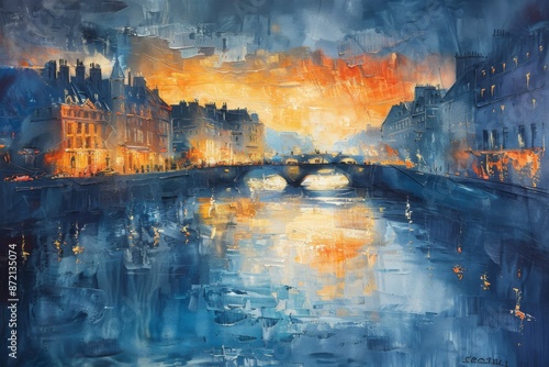city landscape, oil painting, night scene, city landscape, bridge, river, light, building, architecture, evening, glowing, warm colors, water, impressionism, art, artwork, painting, artistic, scenery, beautiful, moody, nightlight, illuminated, romantic, serene, city lights, abstract, silhouette, skyline, shadow, texture, vibrant, gradient, blue, orange, dusk, dawn, twilight, calmness, horizon, city view, visual arts, high contrast, fine art, creative