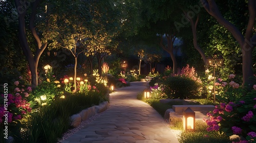 pathway, garden, landscaping, night, lighting, tree, flower, plant, paved, stone, design, decorative, warm, illumination, garden path, tranquil, peaceful, landscape design, exterior, light, ambience, nature, evening, floral, landscape, background, path, illuminated
