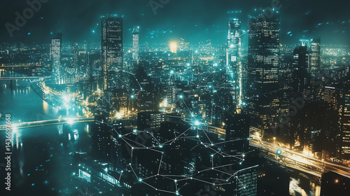 nightlight, modern, business, network, interconnected, city landscape, future, smart, wireless, connect, people, night, city, technology, light, urban, building, skyline, view, computer, design, skyscraper, architecture, street, bangkok, energy, pattern, light, dark, traffic, digital, aerial, downtown, motion, datum, transportation, application, software, cyberspace, solution, skyscraper, tech