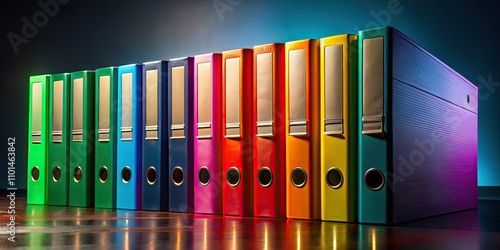 Night Photography of Colorful Office Folders with Soft Ambient Lighting, Organized Workspace, and Creative Stationery Arrangement