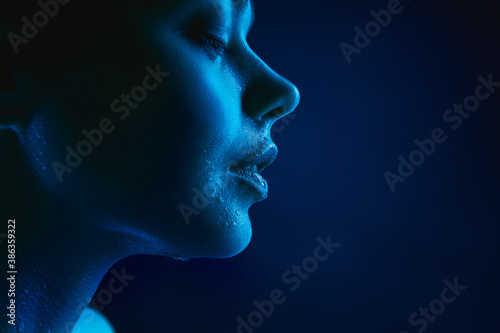 Night. Portrait of female fashion model in neon light on dark studio background. Beautiful caucasian woman with trendy make-up and well-kept skin. Vivid style, beauty concept. Close up. Copyspace