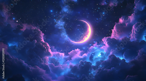 night, sky, filled, oversize, planet, swirling, nebula, cloud, glowing, crescent, moon