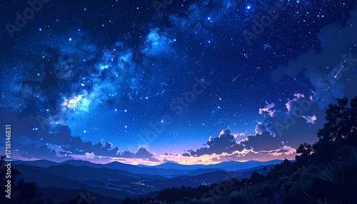 night, sky, star, cloud, mountain, landscape, blue, galaxy, misty, tree, vale, twilight, light, dark, nature, beautiful, huge, majestic, peaceful, evening, scenic, view, panorama, colourful, cosmic, digital, art, stunning, imaginative, dreamlike, painting