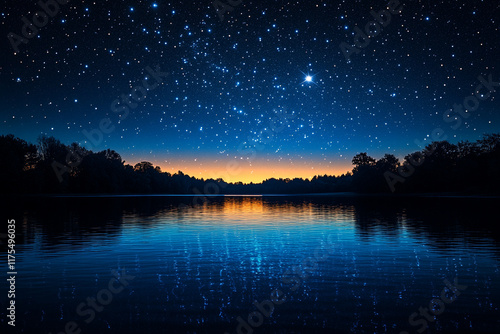 night, sky, star, lake, water, calm, dark, blue, tree, forest, tranquil, peaceful, serene, quiet, nature, landscape, outdoors, scenic, beautiful, starry, bright, cosmos, universe, celestial, midnight, evening, dusk, horizon, shoreline, silhouette, illumination, glimmer, sparkle, magical, wonder, mystery, serenity, stillness, darkness, glow