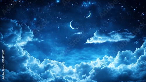 night, sky, star, moon, crescent, cloud, blue, white, dark, cosmic, astronomy, space, galaxy, nebula, celestial, nature, landscape, dreamy, serene, peaceful, romantic, magical, mysterious, beautiful, bright, twinkling, glimmering, fluffy, soft, background, art, photo, digital, painting, illustration, wallpaper, poster