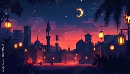 city landscape, night, lantern, arabian, mosque, sunset, islam, illuminated, culture, travel, illustration, silhouette, arabic, muslim, vintage, building, architecture, design, fantasy, town, street, light, evening, moon, star, palm, tree, exterior, beautiful, graphic, digital, art, romantic, peaceful, vacation, tour tourism, traveler, background, vector, drawing, template
