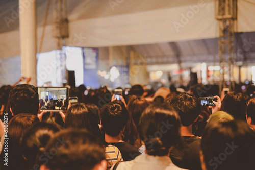 nightlife and youth activity with backside of crowd in concert hall during show hand ,take photo and see their favorite artist