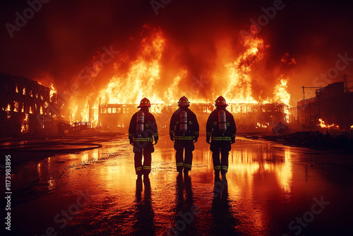 Nighttime Apartment Fire Scene with Firefighters and Ladder Truck Operation