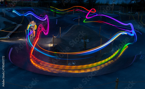 bicyclist, night time, colourful, long exposure, photo, cycle, ride, motion, vibrant, active, recreation, leisure, summer, sport, wheel, path, track, neon, movement, glow, urban, exercise, lifestyle, circuit, creativity, artistic, dusk, twilight, spectacle, entertainment, fun, adventure, curve, illuminated, dynamic, energy, flow, park, evening