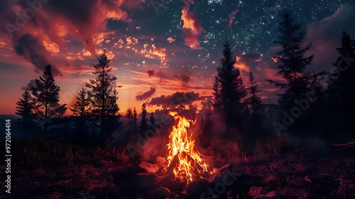 Nighttime campfire in the forest under a gorgeous sky