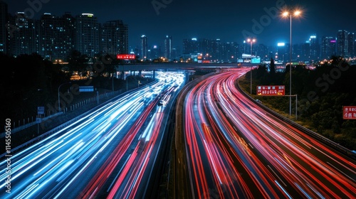 city, light, traffic, night, highway, vehicle, urban, movement, architecture, skyline, illumination, road, infrastructure, speed, transportation, modern, energy, neon, landscape, design, photo, journey, commuter, city landscape, dynamic, vibrant, motion, nightlife, environment, contrast, pattern, scenery, technology, communication, travel, connectivity, structure, view, scene, density, rush, flow, rythm, visual, aesthetic, atmosphere, urbanisation, horizon