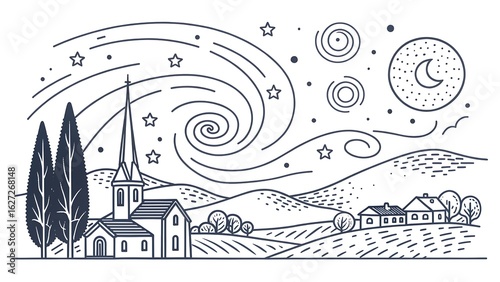church, small, building, tall, tree, landscape, night, sky, star, swirling, cloud, crescent, moon, hill, village, rural, illustration, night time, calm, serene, peaceful, scenic, nature, minimalist, artistic, simple, linear, drawing, nightscape, dusk, horizon, skyline, artwork, visual, quiet, tranquil, mountain, hill