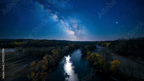 Nighttime Starry Sky over Cumberland River Aerial shot of Cumberland River at night under a sky filled with stars