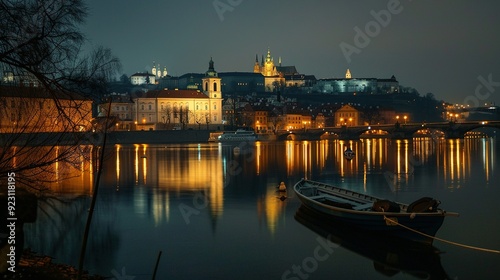 prague, river, water, boat, dinghy, bridge, city landscape, night, dusk, architecture, building, light, street light, sky, dark, cloud, travel, tour tourism, europa, landmark, historic, old, city, town, evening, calm, peaceful, quiet, tranquil, serene, romantic, silhouette, horizon