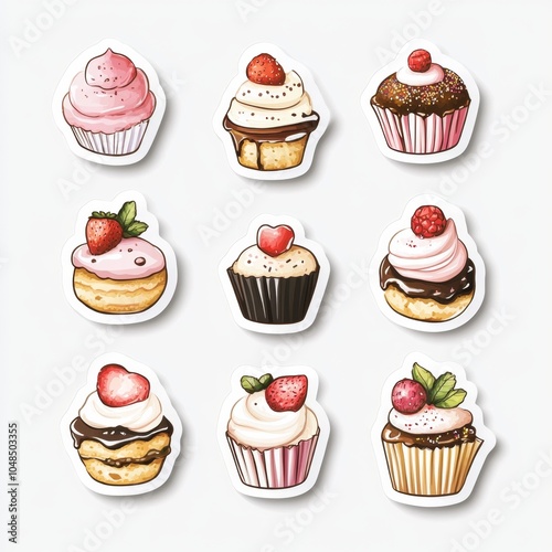 Nine colorful hand-drawn cupcakes with different toppings and decorations.