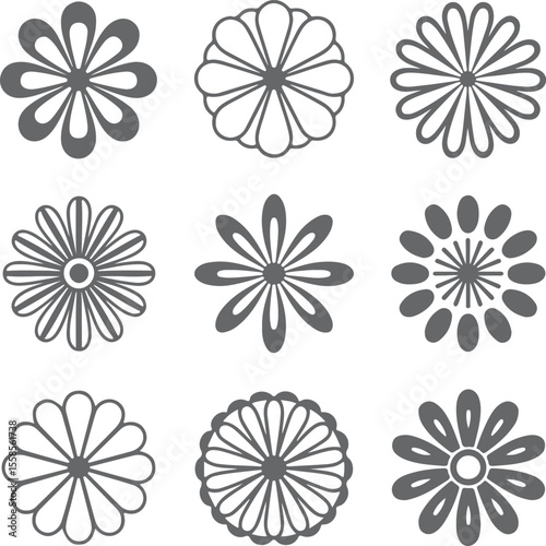 Nine Gray Scale Floral Designs Set Simple Flower Silhouettes Circular Patterns Graphic Elements for Decoration
