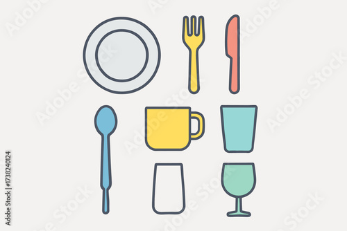 Nine illustrations of tableware and cutlery in a minimalist style. All items are rendered in pastel colors against a light background.