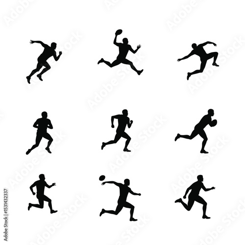 american football, silhouette, player, athlete, running, jumping, throwing, catching, sport, action, dynamic, movement, game, competition, fitness, exercise, vector, graphic, illustration, black, white, background, isolated, set, collection, design, element, sportsman, active, energy, speed, power