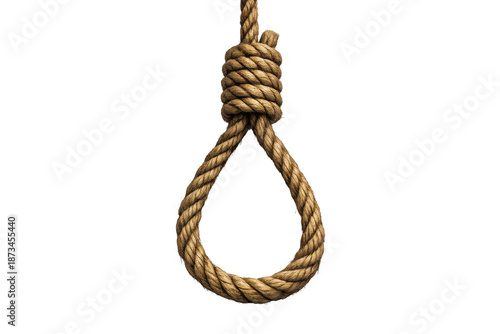 noose, rope, knot, hangman, hanging, gallows, suicide, death, despair, execution, justice, danger, loop, crime, murder, penalty, stress, depression, crisis, termination, end, fear, vintage, old, brown, woven, twisted, natural, fiber, isolated, background, transparent, cut off, cut-out, white, no, people, studio, shot, concept, symbol, threat, violence, legal, felony, problem, sorrowful, trouble, dark