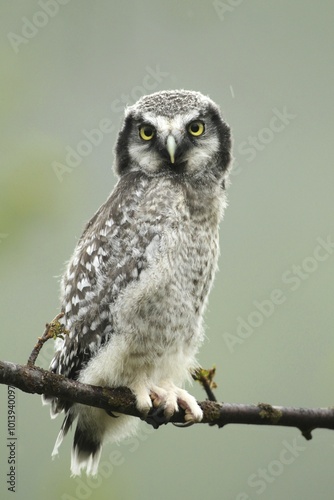 Northern hawk-owl (Surnia ulula), young bird sitting on tree branch in rain, Lapland, Norway, Europe