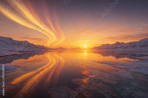 aurora, aurora borealis, sunset, arctic, lake, ice, snow, landscape, glacé, cold, polar, winter, nature, sky, dramatic, twilight, star, colourful, scenic, magical, serene, peaceful, wilderness, remote, mountain, snowy, beauty, natural light, high-coloured, horizon, icy, glacier, mirroring, golden light, dusk, celestial, atmospheric, cloud, snowfield, snow-covered, dramatic sky, illumination, svalbard, norge, lapland