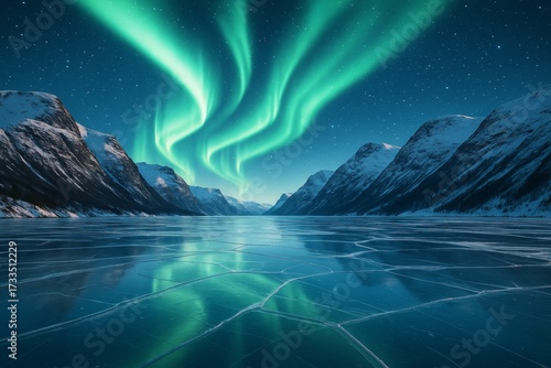 aurora, night, mountain, landscape, background, light, concept, ice, sky, star, snow, cold, nature, glacé, digital, winter, scenic, peaceful, glacier, vale, polar, glow, bright, northern, illumination, horizon, atmosphere, blue, green, quiet, tranquil, serenity, dreamlike, celestial, dramatic, arctic, crisp, chill, wilderness, environment, wonder, soft, magical, ai, generative, illustration
