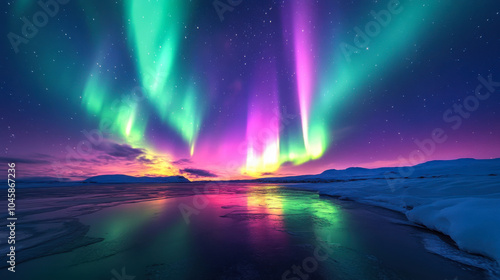 Northern lights illuminate the night sky over a tranquil lake with snow-covered mountains in wintertime Iceland