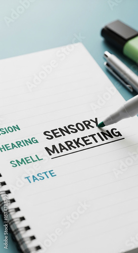 marketing, sensory, strategy, business, notebook, pen, marker, highlight, text, sense, vision, hearing, smell, taste, touch, branding, advertisement, concept, idea, plan, promotion, campaign, design, background, wallpaper, banner, free space, template, advertising, communication, management
