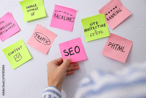 Notes with words and female hand on light background
