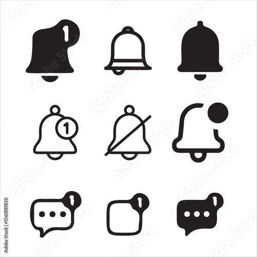 notification, icon, signs, service, sound, set, design, mute, message, communication, bell, symbol, mail, reminder, alert, minimalist, information, notice, ring, black, white