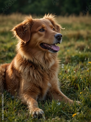 Nova Scotia Duck Tolling Retriever resting in a meadow.
