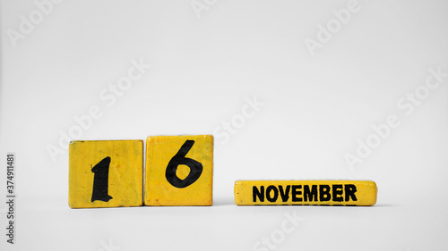 NOVEMBER 16 Wooden calendar. International Day for Tolerance. White background with space for your text