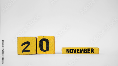 NOVEMBER 20 Wooden calendar. Universal Children’s Day. White background with space for your text