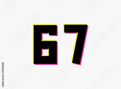 Number 67 vector desing logo. Dynamic, split-color, shadow of number pink and yellow on white background. For social media,design elements, creative poster, anniversary celebration, greeting and web