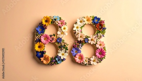 Number 68 made out of flowers with colored background. Photo for 68th birthday or anniversary party