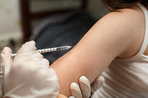 Nurse vaccinating in arm. Health and care concept