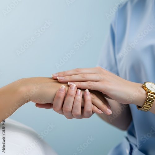 nurse's hand holding a patient's hand with both hands in focus, isolated on a smooth, light-colored background