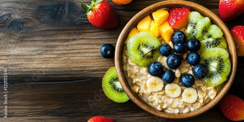 Nutritious oatmeal porridge in a wooden bowl topped with vibrant blueberries, kiwi, mango, and strawberries on a rustic wooden background.