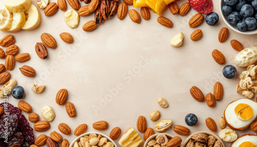 nut, almond, pecan, pistachio, walnut, peanut, cashew, dried fruit, blueberry, raspberry, cheese, boiled egg, snack, healthy, protein, fiber, whole food, organic, natural, overhead, light background, tabletop, assortment, mix, crunchy, savoury, sweet, diet, breakfast