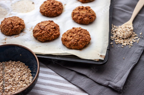 homemade, oat, cookie, morning, delicious, deliciously, food, white, baking, paper, blue, cosy, homelike, background, copy space, care, nourishment, table, light, smell, good, eat, enjoy, spoon, towel, kitchen, warm, aromatic, ingredient, hobby