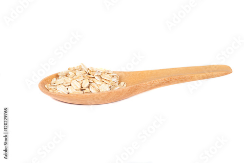 Oats flakes pile in wood spoon on white background