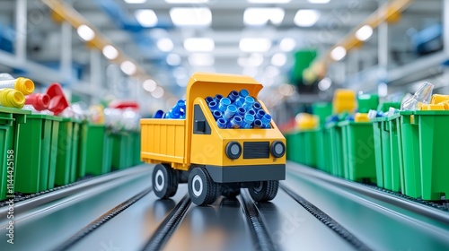 Objects: conveyors, recycled materials. A recycling process with conveyors moving paper, plastic, and glass.
