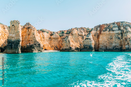 Ocean Landscape With Rocks And Cliffs At Lagos Bay Coast In Algarve, Portugal