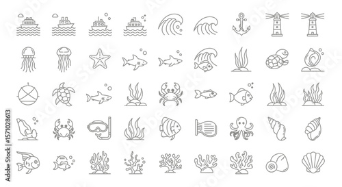 ocean, sea, marine life, underwater, ship, boat, wave, wave, anchor, lighthouse, jellyfish, starfish, shark, fish, crab, octopus, turtle, seaweed, coral, shell, scuba diving, snorkeling, goggles, fin, bubble, swim, beach, summer, vacation, travel, aquatic, outline, line art, vector, simple, modern, nature, wildlife, environment