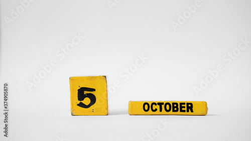 OCTOBER 5 Wooden calendar. World Teachers’ Day. White background with space for your text