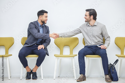 Office, chairs and people in handshake, interview and recruitment for selection or human resources. Waiting room, men and candidate for business, corporate and hiring for employment contract for job