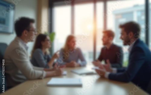 Office Collaboration Blur: Blurred coworkers discussing around a table. High quality