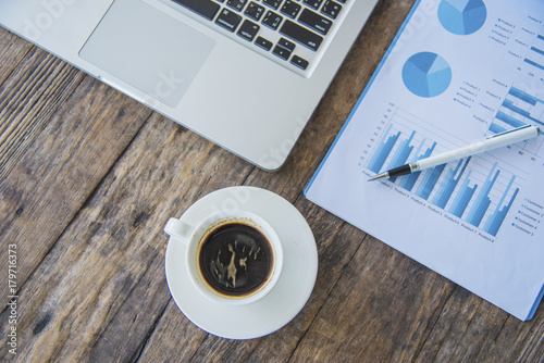 Office desk workplace with pc, charts, smartphone and coffee on wooden table. Top view