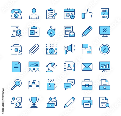 icon, work, office, line, computer, vector, business, phone, desk, stroke, place, icon, flat, home, printer, thin, outline, person, people, chair, man, briefcase, hot drink, businessman, report, clock, clipboard, document, job, money, salary, clip, calendar, time, call, magnifying glass, laptop, set, web, signs, symbol, simple, blue, colours, illustration, isolated, design, graphic, communication