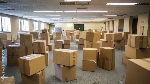 Office space filled with moving boxes, symbolizing corporate relocation and business transitions.